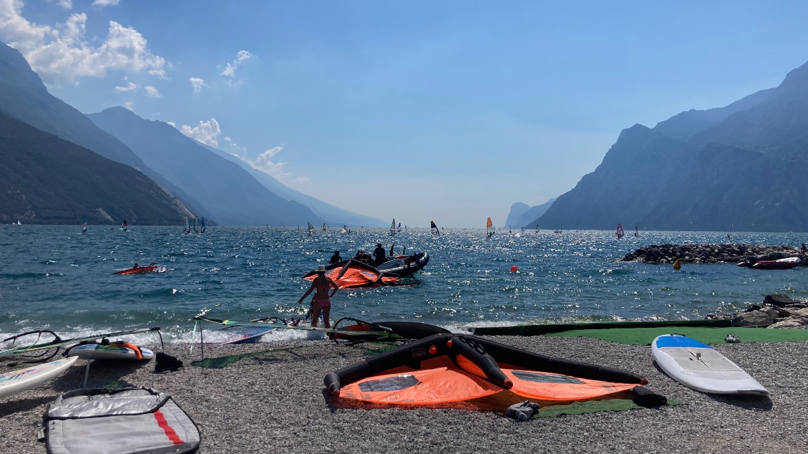 La posición estratégica de la ciudad en el extremo norte del lago crea un efecto Venturi, que canaliza vientos fuertes y constantes a través de las montañas circundantes. El resultado es un paraíso para los amantes del viento, donde los wingfoilers pueden experimentar sesiones vigorizantes impulsados por el famoso viento “Peler” por la mañana y el refrescante viento “Ora” por la tarde. Los tramos de agua plana cercanos a las playas de Torbole proporcionan un espacio excelente para practicar maniobras, por lo que es un spot ideal tanto para principiantes como para wingfoilers experimentados.