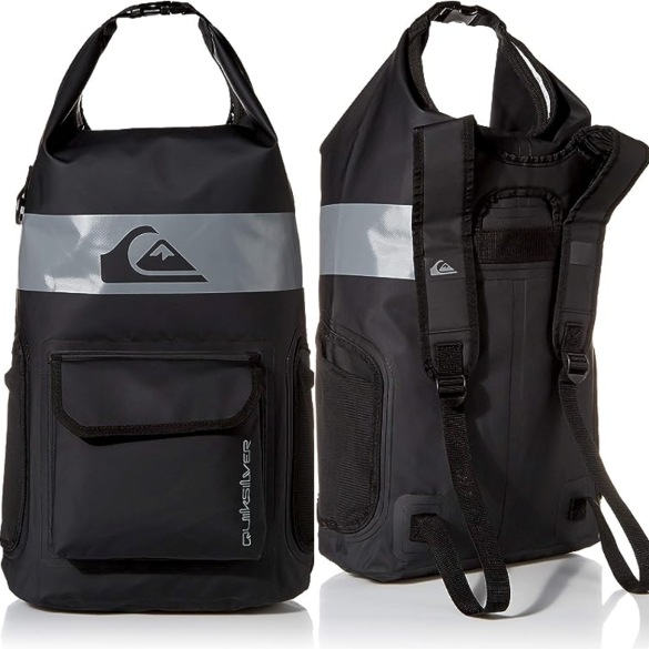 This is the Quicksilver Sea Stash Mid Dry Water surf bag which is also a backpack. It can fit a beach towel, sandles, head phones and a couple of sodas. Storage volume: 20 litres.