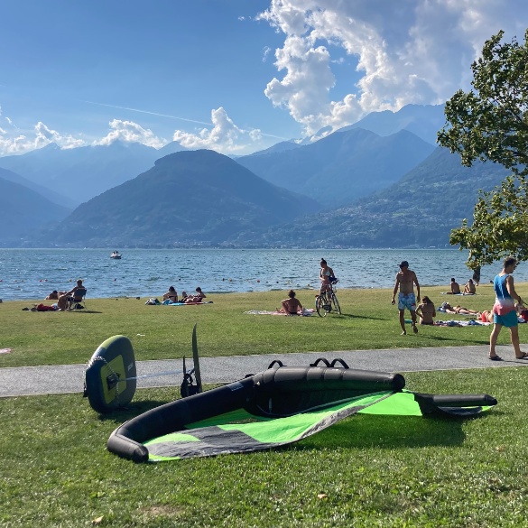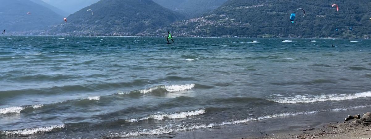 Normally the wind comes on shore from the lake. From the beach on the right there is a beginners area, advanced riders can ride kilometers before reaching the shore on the other side of the lake. There are various small beaches on Wingfoil-distance so you can even make a scenic route with various stops across this part of the lake. Lake Como benefits from the renowned “Breva” wind, which sweeps down Lake Como’s vast expanse, providing consistent and reliable wind conditions. This natural phenomenon creates ideal opportunities for exhilarating wingfoiling sessions, where riders can effortlessly glide across the serene waters.