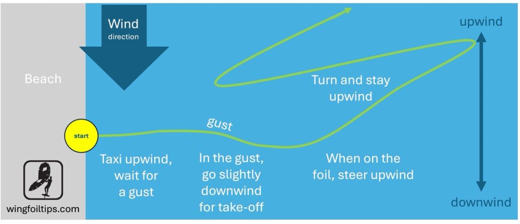 Once you have certain level of wingfoil going upwind is quite easy. You will use the downwind momentum to get on the foil. While you taxi, you stay heading upwind as much as you can, and you try to relax. You wait for the gust to come. As soon as the gust comes, you steer downwind and allow for the board to speed up. Help by pumping if needed. Once you get on the foil, turn back upwind and recover your ground.
